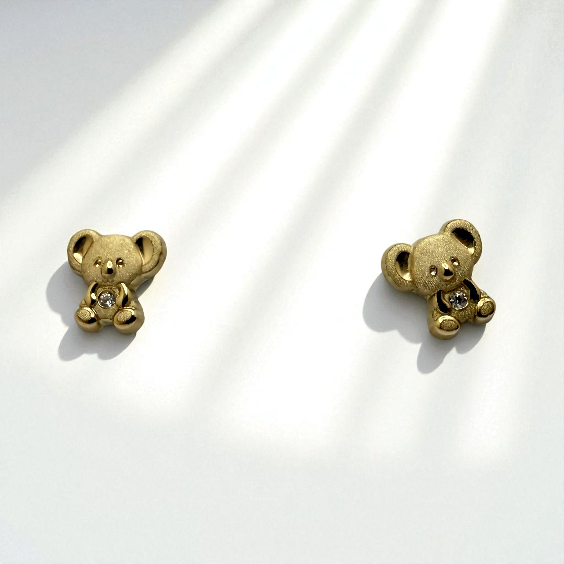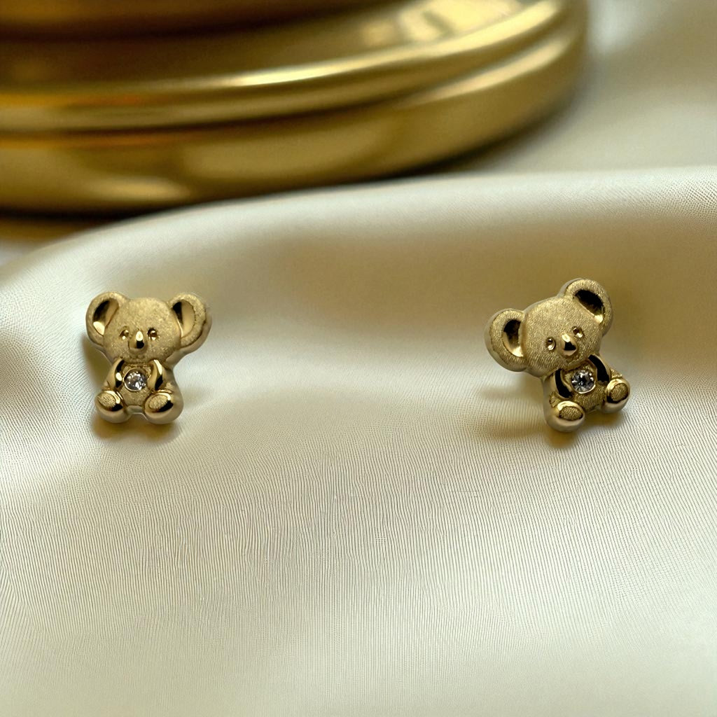 These adorable bear earrings are crafted in solid 14K yellow gold and accented with sparkling cubic zirconia stones for a playful touch of brilliance. Weighing 0.7 grams, they offer a charming blend of fun design and subtle elegance, perfect for everyday wear or as a sweet gift.