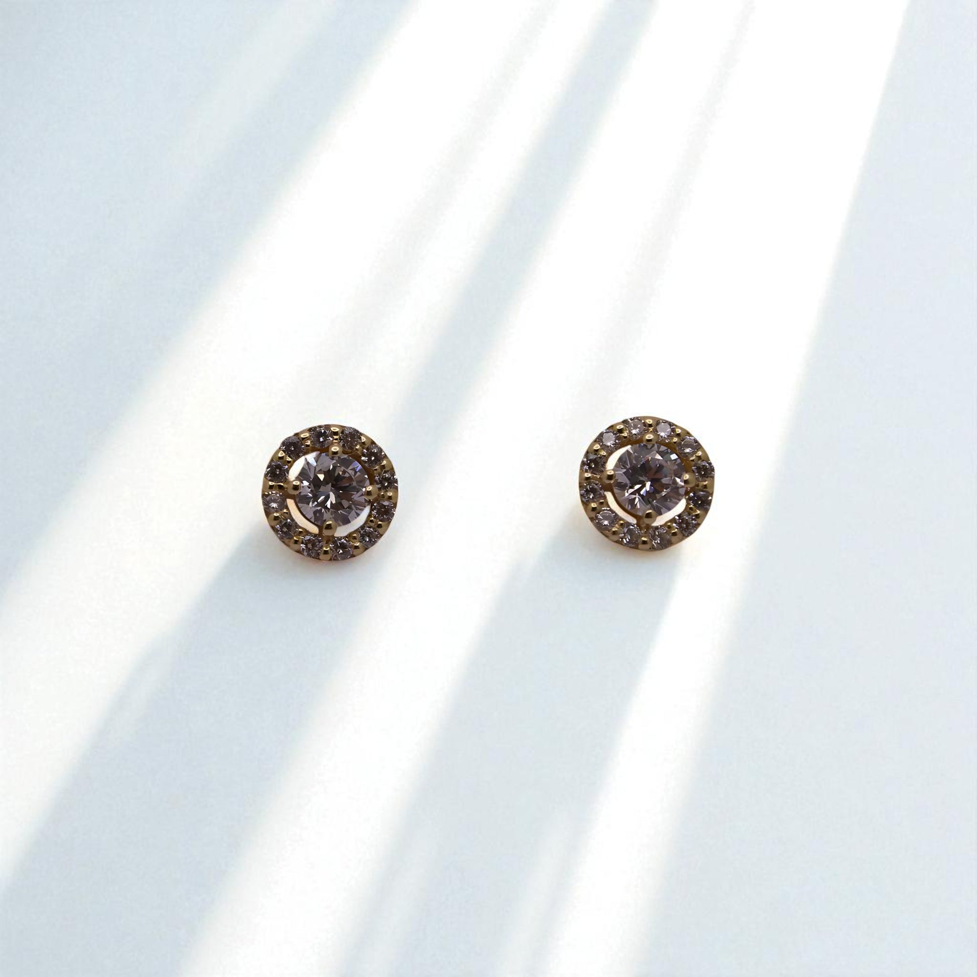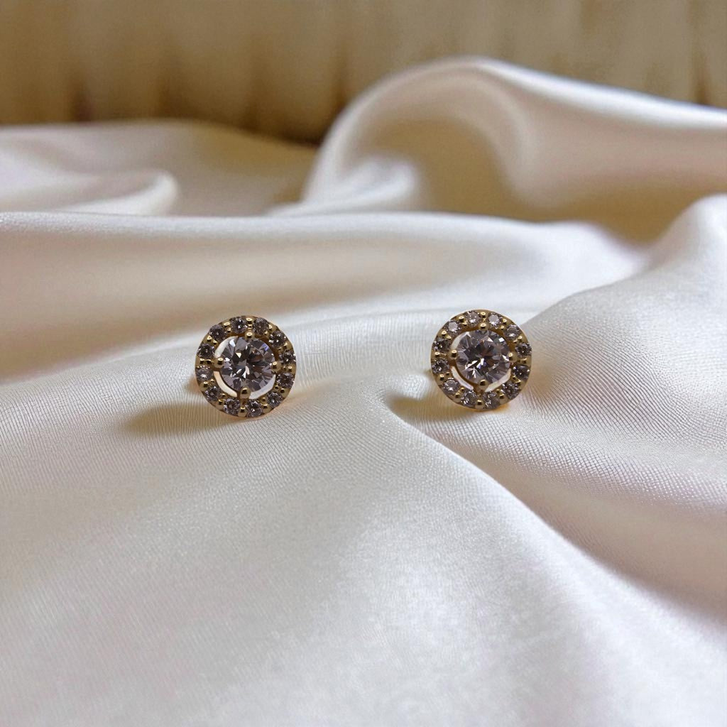 These elegant halo earrings are crafted in solid 14K yellow gold and feature sparkling cubic zirconia stones surrounded by a radiant halo for added brilliance. Weighing 1.0 gram, they offer timeless elegance and versatile style, perfect for both everyday wear and special occasions.